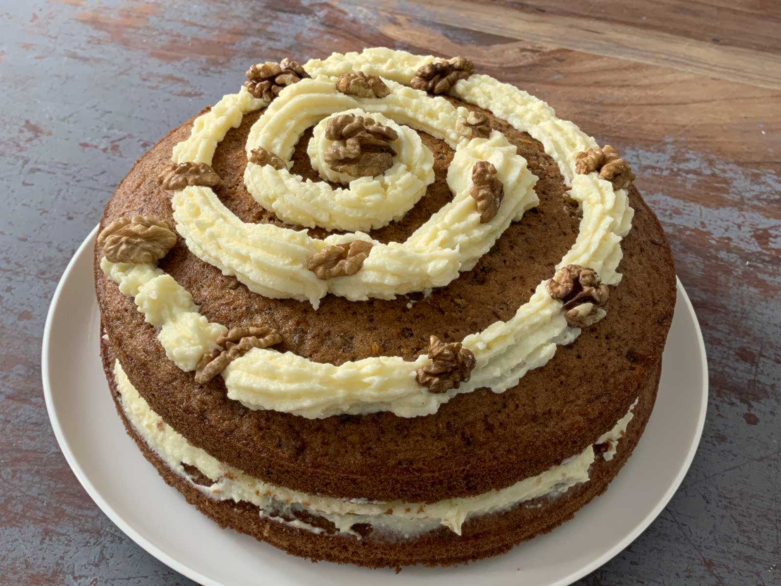 Met wortelen, walnoten, rozijnen en cream frosting